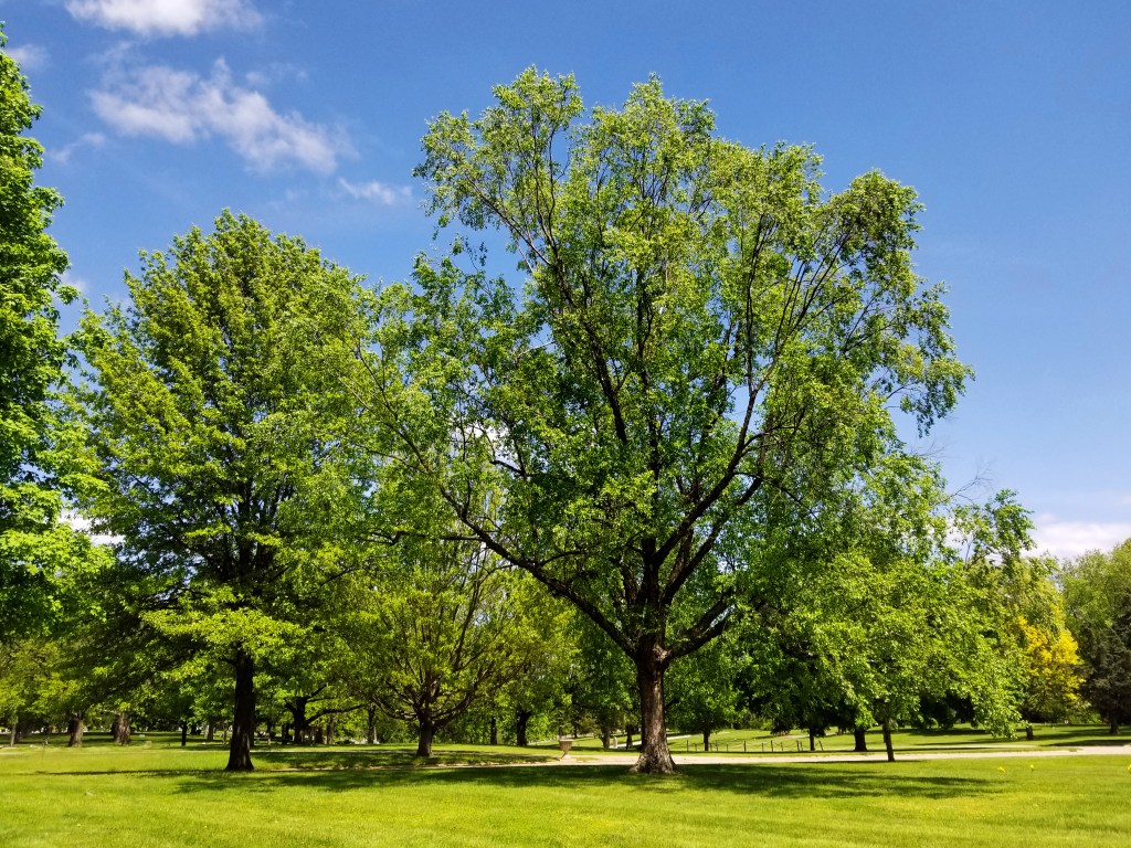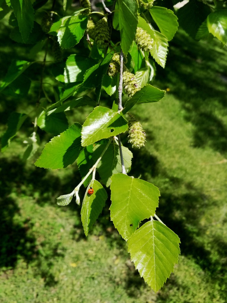 0-111 – This is a fine specimen of the native River Birch (Betula nigra), found planted in a few other places at Oak Ridge and elsewhere in Springfield. It is unusual for birches due to its tolerance of heat and its resistance to the bronze birch borers that kill many other birches in our difficult Midwestern climate. In the wild it is found along streams and in other periodically wet areas.